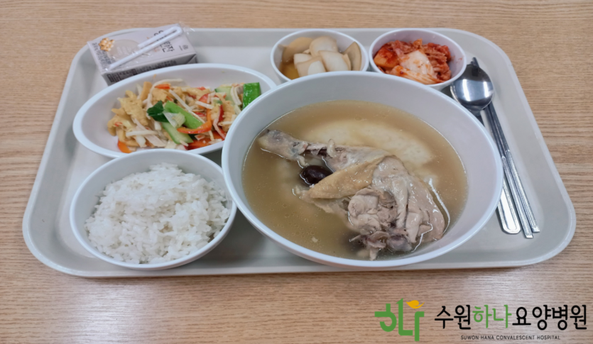 [주간급식표] 수원하나요양병원 첫 초복 작성일 : 2022.07.16 수원하나요양병원 댓글 : 0 조회 : 3,417 닭다리와 찹쌀 넣은 삼계탕과 수제 양파장아찌 제공해드렸습니다. 후식은 영양만점 두유로 어르신들이 즐거워 하셨습니다.